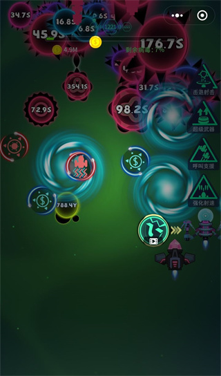 这个副武器优秀的地方就是可以追踪病毒,不会那么容易浪费一枚导弹,但它追踪病毒的时候转弯会有点缓慢,而且有时候会穿过近处的病毒绕到后方去攻击后面的病毒,这就让人感到有些烦恼,用起来也有点尴尬,射击速度还算可以,毕竟是左右交替发射,也是一个瞬间群体伤害的副武器,但是我亲自测试了一下满级体验,结果让人意外,这个我觉得真的不好用,在191关卡,我复活了都无法通过,但是大家也不用考虑我的技术问题……普通的武器