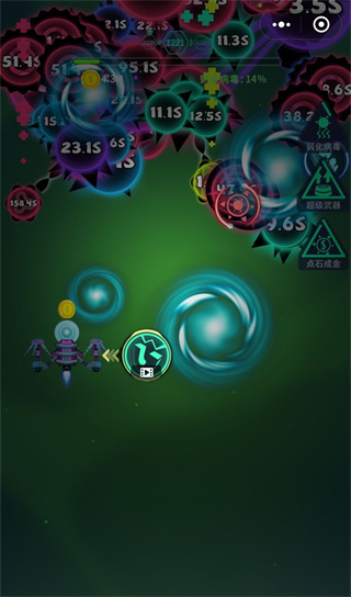 这个副武器的功能是在几秒时间内发射一个气泡,当将范围提升到最高级别之后(32级),会释放出一个巨型气泡,大家尝试过满级感受之后可能都认为很强大,这么大的气泡不就无敌了吗,但实际情况并非如此,这个气泡无论范围等级多高,还是无法改变它的缺陷,那就是它碰撞的次数,当它碰到病毒第三次时就会破裂,这三次的攻击,造成的伤害可以说微不足道(本人试过满级体验,就算999火力攻击一次也只能让病毒分裂),个人感觉比较坑人,所以这个不推荐大家使用。