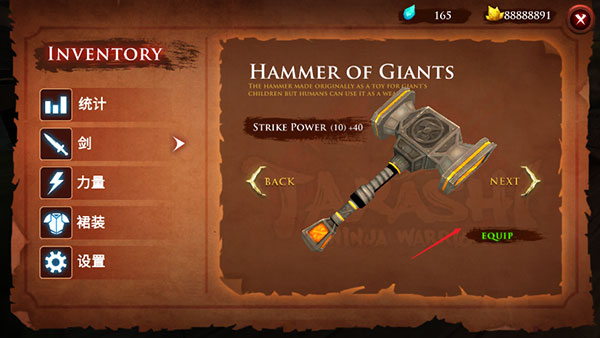 4、点击右上角暂停按钮进入菜单,可查看武器、属性、服饰等详细信息,点击EQUIP选项可更换新型武器装备与防具套装。