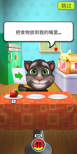 2、使用拖拽操作将餐桌上的食物送入汤姆猫口中。