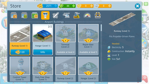 1、初始布局划分明确,右侧航站区作为核心区域可设置跑道、停机位、控制塔等航空设备。基础螺旋桨飞机仅需最短跑道即可运行,每座停机坪仅容纳单架飞机。随着进程推进,大型机型需要更广阔起降场地。