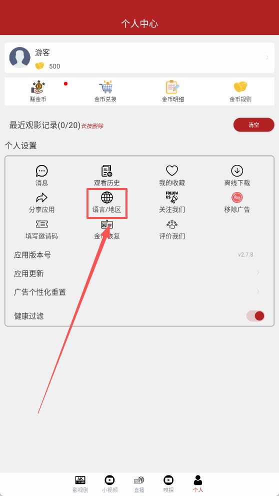 3、进入个人页面以后,可以看到选项功能“语言/地区”,点击选择中文即可!