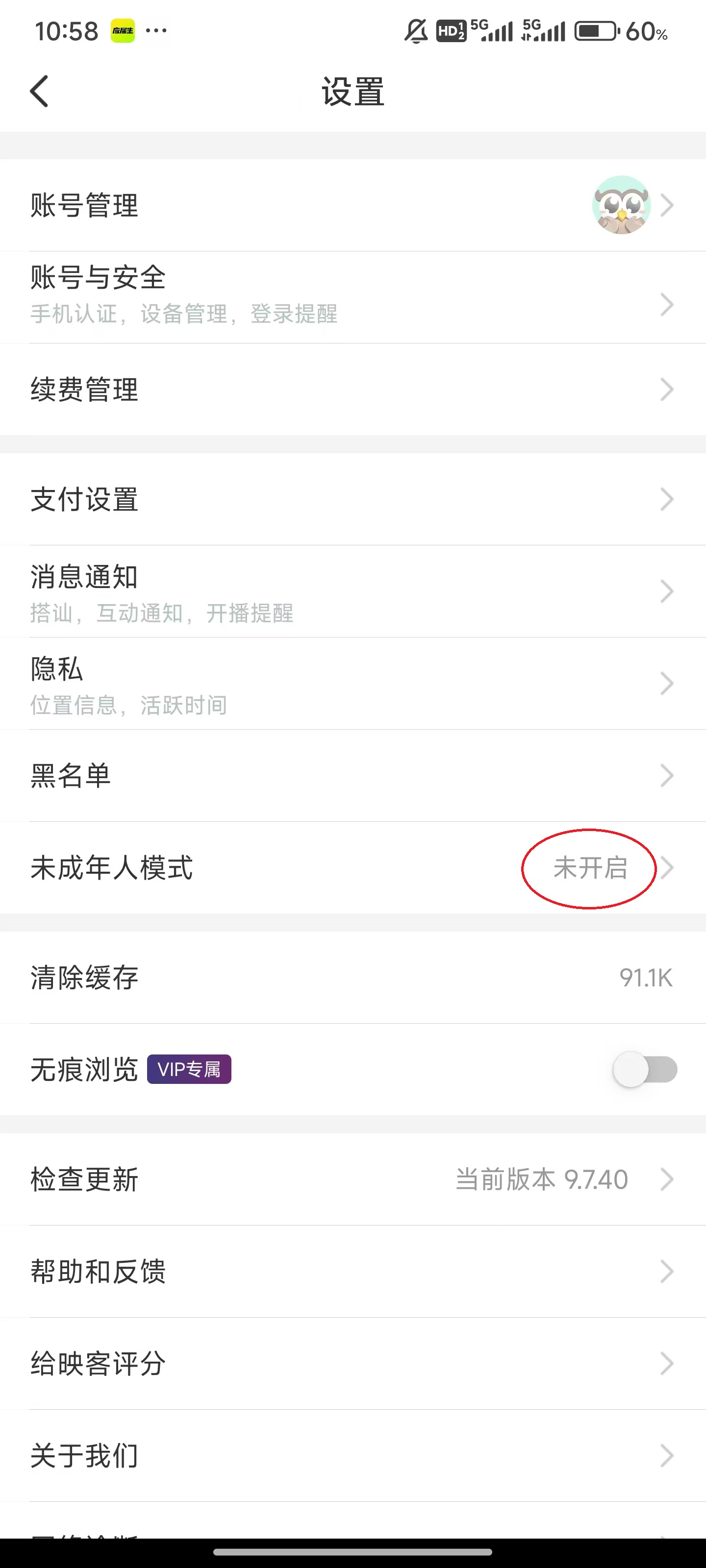 3、选择界面中部“未成年模式”右边的“未开启”。