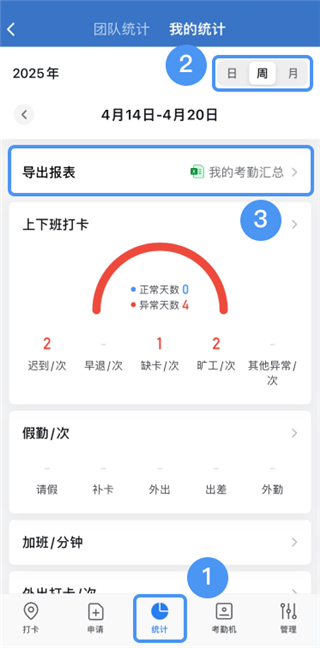 1、考勤人员可在【手机端->工作台->考勤->统计->个人统计】中,查看自己的上下班和外出打卡记录。支持按日/周/月切换查看,数据核对更便捷。