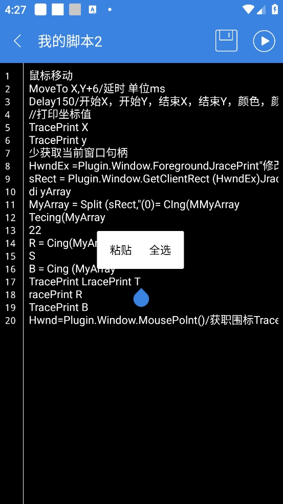 5、选取任意游戏辅助脚本代码填入编辑区,完成编写后点击右上角运行按钮