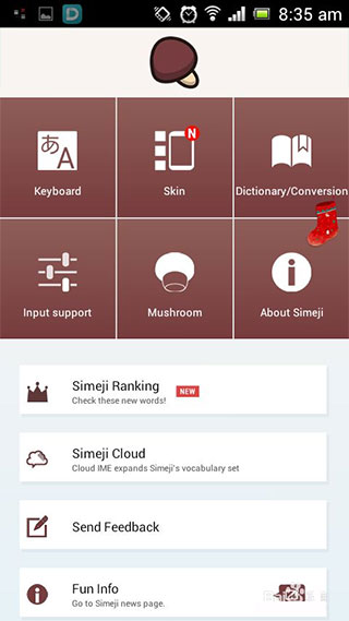 1、启动simeji应用,默认采用九宫格滑动输入。点击界面右上方齿轮图标;